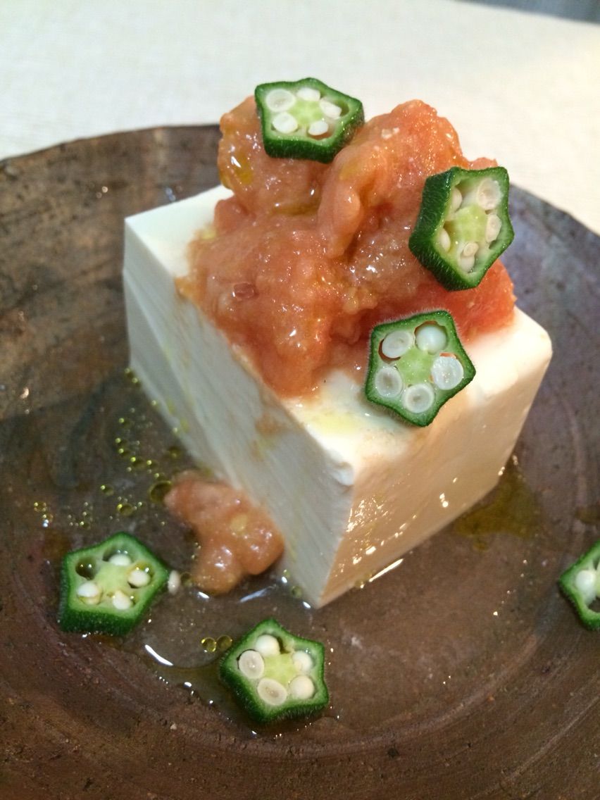 冷や奴にかけて、ジャンボオクラをのせ
