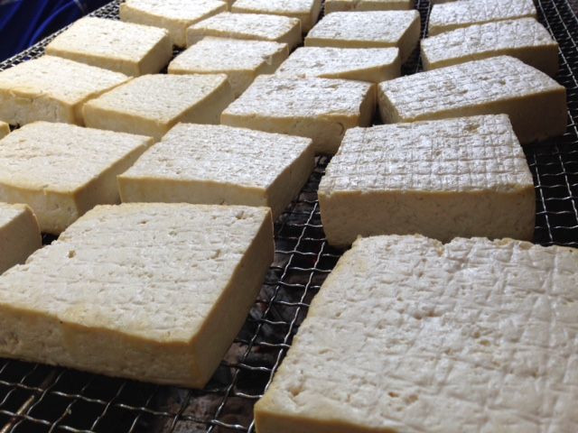てもらった豆腐を半分に切り、炭火で炙